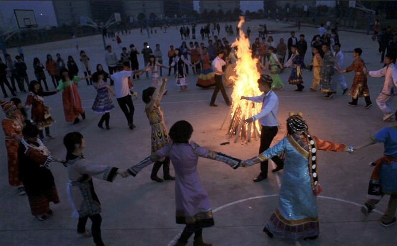 昨日晚,为迎接我校十周年校庆的到来,我校32个民族的学生在篮球场升起篝火,载歌载舞,祝福学校的明天更美好。