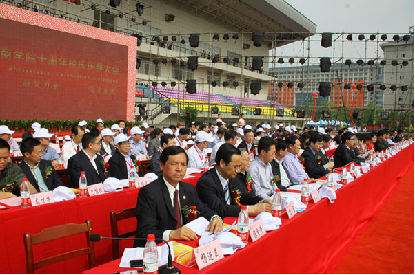 新闻中心讯(记者王林丽孙婷婷徐玥王聪)十载栉风沐雨,十年春华秋实。5月2日9:30,黄家湖畔繁花似锦,彩旗猎猎,洋溢着一派喜庆祥和的景象,我校十周年校庆庆典大会在体育场隆重举行。