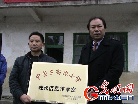 光明网讯(记者 夏静 通讯员 狄奥)2012年11月5日武汉长江工商学院党委书记陈伟带领该校教师代表、学生代表,来到恩施鹤峰县中营乡高原小学,向校友邓丽所在高原小学捐赠现代信息技术室。