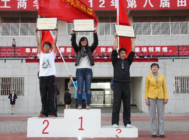 运动会总裁判长王翃老师宣布了本次比赛的最终成绩:政治与法学学院、工学院、管理学院荣获道德风尚奖;电子商务学院、经济与商务外语学院、政治与法学学院分别以291分、197分和165分的好成绩,荣获“团体总分”前三甲;电子商务学院、政治与法学学院、经济与商务外语学院分别以175分、120分和105分荣获“男子团体总分”前三甲;管理学院、电子商务学院、经济与商务外语学院分别以122分、116分和95分的成绩荣获“女子团体总分”前三甲。