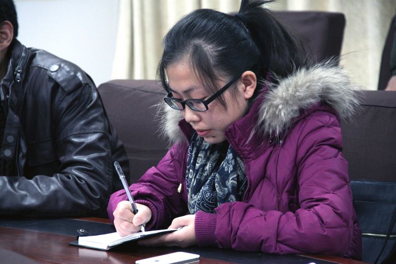 图为学生代表正在记录发言(摄影记者 高政 摄)