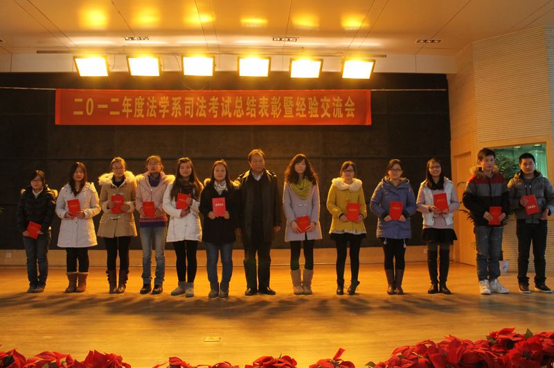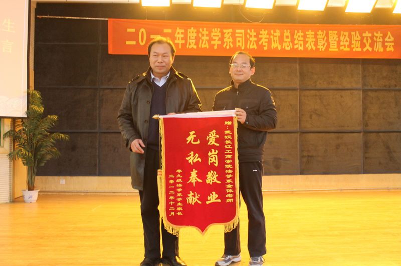 在今年的司法考试中,我校法学系09级学生司法考试成绩再创新高,122人报考,63人通过,通过率高达52%,远超全国平均通过率9.5%,更高于省内多数一本高校,在同类院校中名列前茅。 此次表彰按照学生司法考试成绩的高低设立奖项,其中一等奖14人,二等奖19人,三等奖20人,优胜奖9人,优胜班级1个。表彰大会上,陈伟书记为一等奖获得者颁奖,张兆学副院长为二等奖获得者颁奖, 范红霞副院长为三等奖获得者颁奖,李文专主任为优胜奖获得者颁奖,郑雪芹老师为优胜班级颁奖。陈伟书记在表彰大会上发表讲话,他说,法学既是一门理论学科,又是一门实践学科,同学们要善于思考,努力实践,将所学知识运用到社会实践中,他还勉励低年级的同学们要向获奖的同学们学习司法考试经验,充分利用优势资源,刻苦学习,争取再创佳绩。 我校司法考试第一名获得者孔祥君在会上介绍考试经验。“在复习备考阶段科学学习的方法很重要,我经常采用联想类比法、画图法、口诀记忆法、睡前回忆法等,这对我复习非常有用。”孔祥君谈道,自己利用数轴来记忆,把所有的知识都罗列到数轴上,横轴代表意义,竖轴代表含义,这种形象而立体的记忆方法可以把很多知识串联起来,形成完整的知识结构。 会议的最后,一位学生家长走上了台,他是法学系学生朱传书的父亲朱先生,他代表全体通过司法考试学生的家长向学校敬献题为“爱岗敬业无私奉献”的锦旗,表达内心的感激之情,陈伟书记接过锦旗,并代表学校和政法学院向家长们表示感谢。
