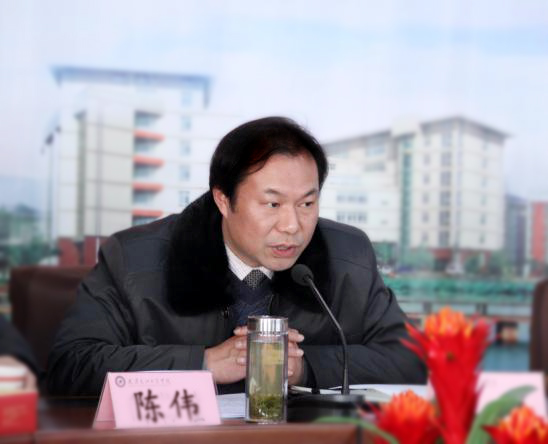 图为校党委书记陈伟在会上宣读工作目标考核规则 摄影:林倩