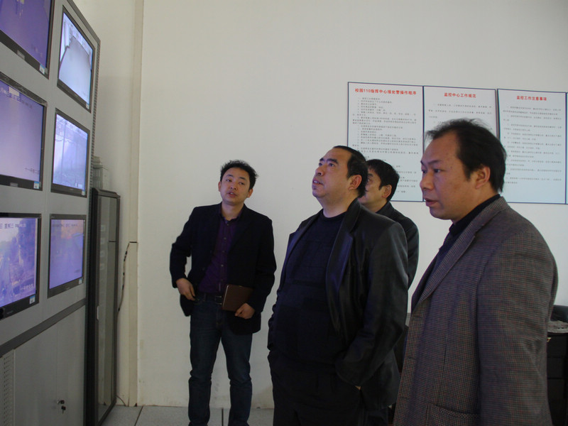 随后,张文斌一行在陈伟及相关职能部门负责人的陪同下,从校园监控室中查看了整个校园的安全状况,并实地考察了我校的学生宿舍和食堂。