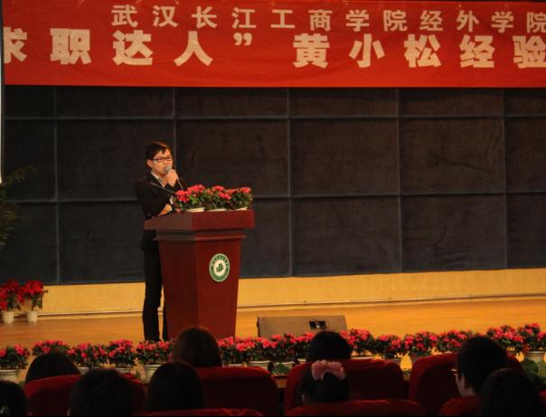 新闻中心讯(记者 莫玉津 史蓉珍 孙琳黎)14日下午,我校学术报告厅人头攒动,在《非你莫属》上求职成功的“霸气哥”、经济与商务外语学院学生黄小松回校做报告。校党委书记陈伟、经外学院院长童光荣、宣传策划部部长狄奥、经外学院党总支副书记王曼以及各学院分团委书记出席会场,各学院学生代表300多人参会。报告会由经外学院学生会主席孟舒主持。