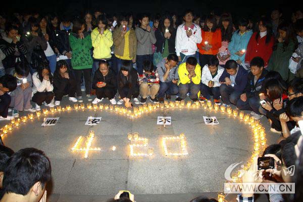 记者在现场看到,由烛火组成的心形图案里,“4.20”、“雅安不哭”置于心形图案中间。百余名大学生围绕心形图案为灾区人民祈福。