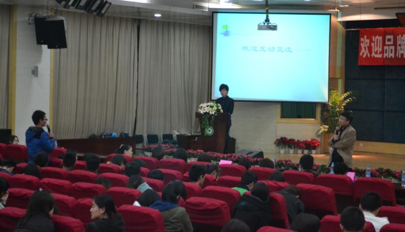 舒咏平教授以“瑞航国际航班因两名中国人打架返航”、“伪意大利品牌”、“全世界对中国‘限奶’”3个事例为引,提出中国品牌遭遇危机的现状,由此引出“当代大学生应当怎样树立自我品牌”的话题。