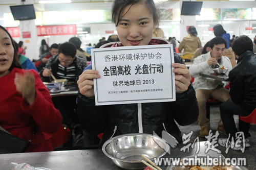 该校青协电商分会会长邓慧介绍,此次“光盘活动”由香港环境保护协会主办,邀请了五所高校协办,包括武汉长江工商学院、武汉大学、三峡大学、中国地质大学和华中师范大学。