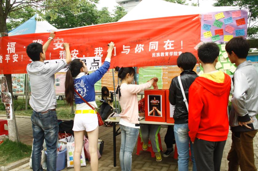 新闻中心讯(记者 陈聪)4月23日上午,经过前期的微博大力宣传之后,我校青年志愿者协会开始在一、二食堂门口设点为雅安灾区募捐和祈福签名。与此同时,民族教育学院分团委在外语楼对面设点为雅安募捐,并邀请过往同学为雅安同胞题祝福语以及签名。