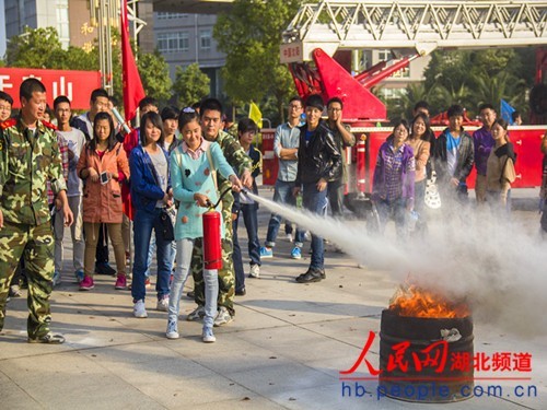 人民网武汉11月8日电 (莫玉津)“同学们!发生火灾了,一定不要慌张,请拿起身边的湿毛巾捂住口鼻,有序地沿着墙壁和楼梯疏散……”11月7日,在武汉长江工商学院综合楼三楼教室,学生用湿毛巾捂着口鼻,朝窗外挥手“求救”,在消防官兵的指导下,“被困”学生安全逃离到教学楼前的空地,被疏散到指定位置。这是发生在该校 “‘119’防灾减灾消防演练活动”上的一个场景。该校千余名师生共同参与了此次消防演练活动,学习消防知识。
