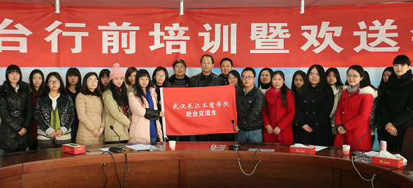新闻中心讯(记者 钟文桂 陶冬) 1月3日上午,武汉长江工商学院赴台行前培训暨学生欢送会在综合楼第一会议室举行。武汉长江工商学院党委书记陈伟,副校长刘腾红,教务部部长吴敏,管理学院常务副院长李明,经外学院常务副院长张晓骏,电子商务学院副院长魏华,国际合作交流处副处长马冬玲出席会议,湖北省台办交流处处长邢军志,湖北省台办审批处处长祝新梅作为特邀嘉宾出席会议,该校20多名赴台学生参会。会议由马冬玲副处长主持。