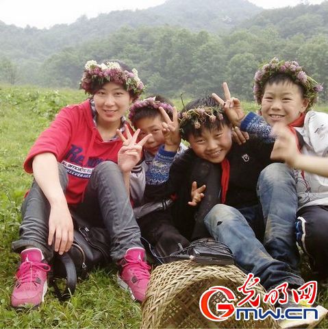 邓丽与孩子们在草地上玩耍时的留影。邓丽/供图