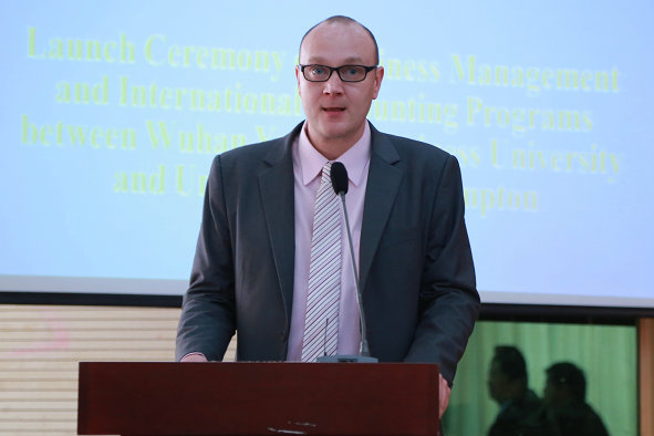 Mr. Simon Kelly对此次邀请来校参加揭牌仪式表示感谢,他表示,在这次合作项目中,具有重要意义的一点是武汉长江工商学院与北安普顿大学将提供交流机会,北安普顿大学的导师会来中国进行专业课程授课,武汉长江工商学院的学生也有机会赴英学习。