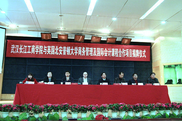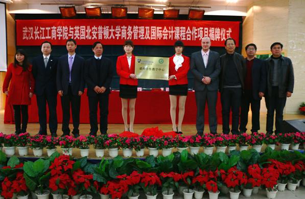 新闻中心讯(记者 熊晓艳 史蓉珍)3月14日下午2:30,武汉长江工商学院与英国北安普顿大学商务管理与国际会计课程合作项目揭牌仪式在武汉长江工商学院学术报告厅举行。英国驻上海总领事馆商务领事Mr.Simon kelly,英国北安普顿大学中国首席代表黄哲,国际会计师公会中国代表处市场总监周泽,武汉长江工商学院校长张金隆,副校长刘腾红,经济与外语学院院长童光荣,管理学院常务副院长李明及教务部部长吴敏、宣传策划部部长狄奥、国际合作交流处副处长马冬玲出席了仪式,仪式由马冬玲主持。