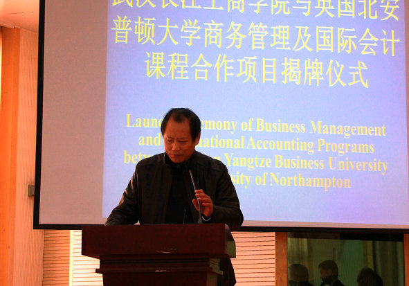 仪式完毕,周泽总监向武汉长江工商学院师生详细介绍了两校商务管理与国际会计课程合作项目体系,他表示,学校此次的合作项目跟以往的项目合作方式不同,学校学生大部分时间都在校内学习英国学校的课程,北安普顿大学将派导师在校内教学。