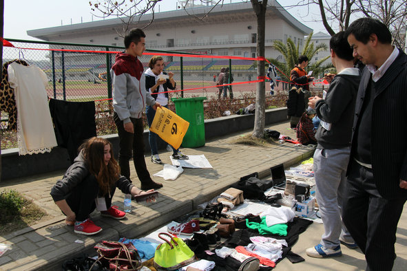 图为同学们在跳蚤市场做爱心义卖 摄影:林典