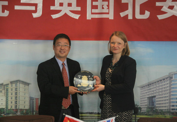 图为校长助理左宗文向英国北安普顿大学商学院院长Dr.Mairi Watson赠送我校礼品 摄影:林倩