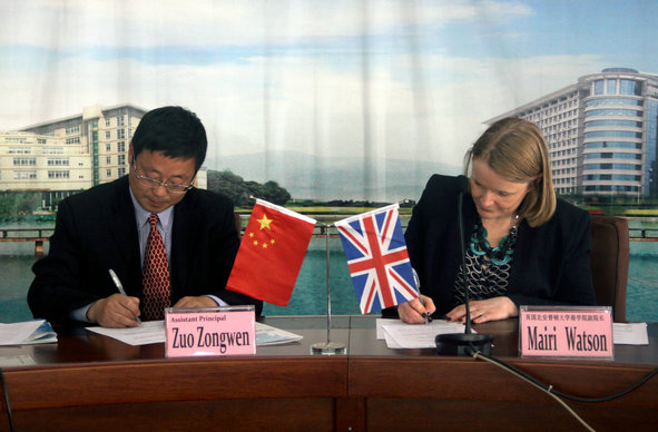 图为我校校长助理左宗文与英国北安普顿大学商学院院长Dr.Mairi Watson签署合作备忘录 摄影:林倩