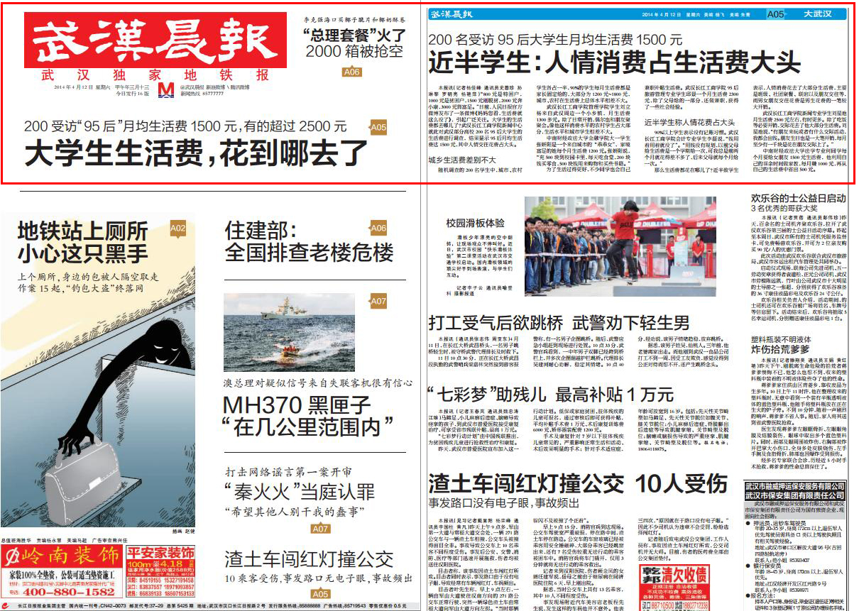 武汉长江工商学院新闻专业学生刘星池月生活费2500元左右,有时更多。除了吃饭等必要开销,交际花去了他大部分生活费。刘星池说,“有朋友来玩或者有什么交际活动,我都会出钱。朋友生日也是一大笔开销,每月至少有一千块是花在朋友交际上了。”