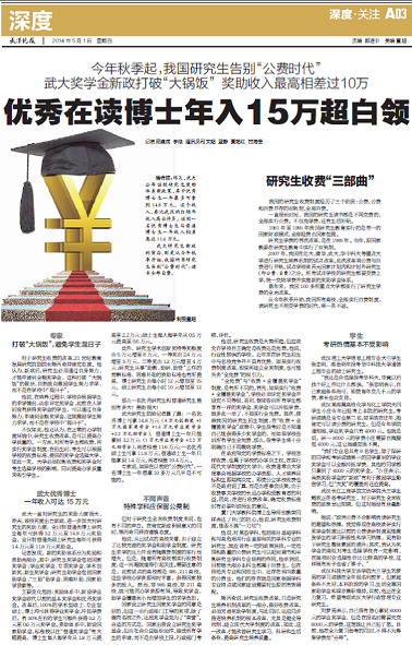 编者按:昨天,武大公布该校研究生奖助体系新政策,其中优秀博士生一年最多可拿到14.8万元,这个收入,要比武汉的白领年收入高出许多。该校一名优秀博士生与普通博士生一年收入相差高达11.6万元。武大研究生新政的背后,则是从今年秋季开始,我国所有研究生告别“公费时代”:读书全部自费。