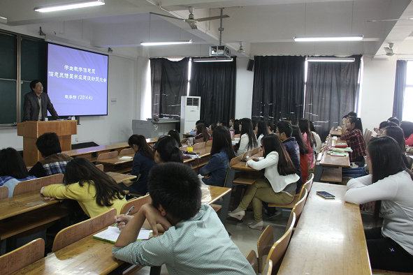 随后,卢炎生副校长对学校教风学风建设情况作出了总体评价:去年以来,学校狠抓教风学风建设,学校教风、学风状况有了明显的进步,但仍然存在不少问题。比如极少数教师的责任心不强,教学方法不佳,课堂管理能力较差,学生在课堂上玩手机、吃东西、坐“后排”等现象依然存在,因此要加紧加快地进行整改。“只有提升学校整体的教风学风状况,推动教师发展和学生成长成才,才能提升教育教学质量,促进学校的内涵式发展”,他指出,要通过全校上下的共同参与和努力,形成齐抓共管的强大合力,营造建设优良教风学风的浓郁氛围。他介绍,学校近年来加大教学投入,用以改善教学条件和提高师资水平。2013、2014两年学校在实验室的建设、改造上先后投入近2000万元;引进博士以上学历及高级职称教师近30名,充实优秀师资力量。卢炎生强调,教风学风是学校文化的一种体现,事关学校人才培养质量、社会声誉、形象和学校的长远发展,希望全体学生教学信息员继续关注教风学风问题,做好质量监督和情况反馈工作。