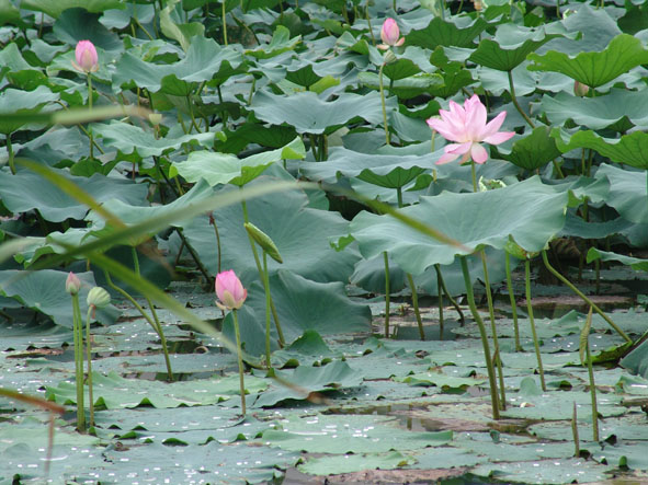 盛夏,满池荷花盛开,荷叶田田,鱼儿嬉戏,蜻蜓点水,别有一番动人的景致。