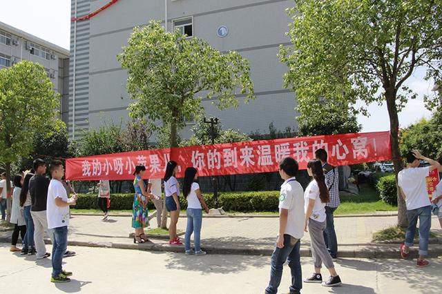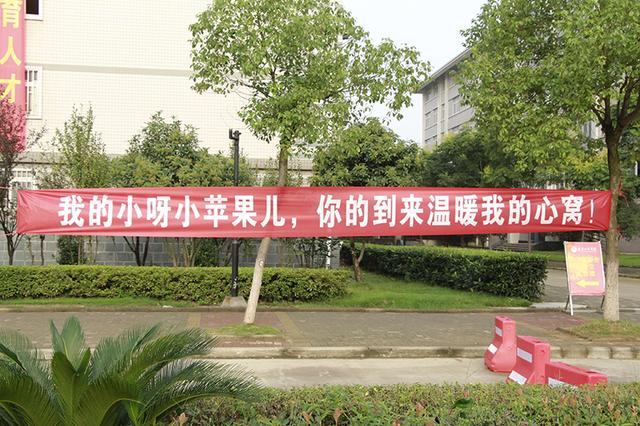 9月3日,武汉高校迎来新生报到季。武汉工商学院为迎接新生,拉出“我的小呀小苹果儿,你的到来温暖了我的心窝!”横幅,引起家长和新生围观。