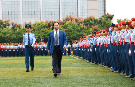 大会首先进行阅兵式。来自该校各学院的46支军训方队在此接受首长的检阅。“同学们好!”“首长好!”“同学们辛苦了!”“为校争光!”在军训团团长的陪同下,校党委书记陈伟检阅方阵。