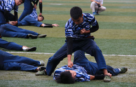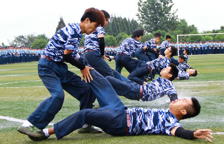 随后,军体拳表演开始,来自各学院方阵精英组成3个军体拳方阵分别进行了男女军体拳术、对博、武术格斗的表演,他们动作齐整,口号响亮,每一招式都威武有力,充分展示了新生们半月来的军训成果。