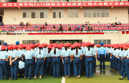 新闻中心讯(记者 欧啸虎)黄家湖畔军乐嘹亮,彩旗飘舞,9月19日上午9:00,武汉工商学院2014级新生军训成果汇报大会暨开学典礼在校田径运动场上隆重举行。空军预警学院黄陂士官学校兵器应用系副主任赵守坤中校,武汉工商学院领导彭秀春、张金隆、陈伟、向太斌、卢炎生、刘腾红、桂裕清、左宗文、张俊、王程军及二级学院、相关职能部门负责人出席典礼。大会由校长助理、校办主任张俊主持。