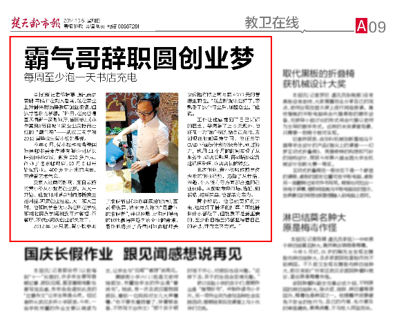 工作让他感觉到了自己知识的匮乏。每周除了上6天班外,他还花一天“泡”书店,给自己充电,直到现在他都坚持学习。他还自学CAD平面设计和初级会计。通过努力,他用11个月的时间实现了从服务生、到店长助理,再到拓展部营建经理助理、分店店长的转变。