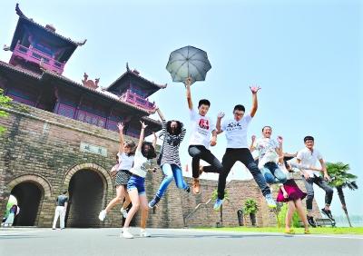 在首义广场上,大学生们站在辛亥革命博物馆那一片“楚国红”前留影。“咔嚓”一声,伴随的是愉悦的呼喊:“武汉,我来了!”(记者黄琪)