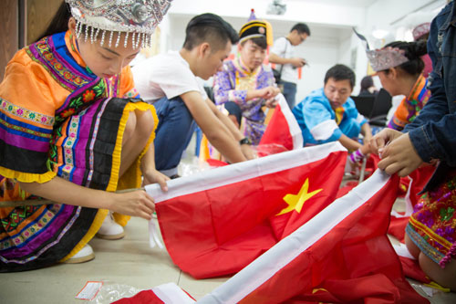 9月29日上午,武汉工商学院少数民族大学生身着绚丽的民族服装,来到武汉市水果湖街茶港社区,给社区居民送来了2500面国旗,并和居民们一起在小区里悬挂,让居民们感受到了浓浓的爱国热情和深深的民族情谊。