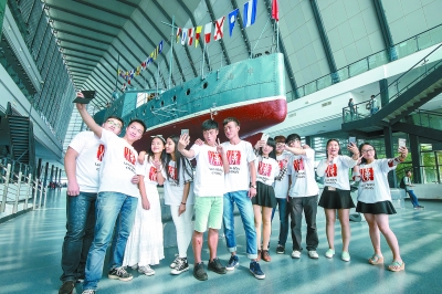 昨日,在金口中山舰博物馆内,学生们在复原的中山舰前自拍留影