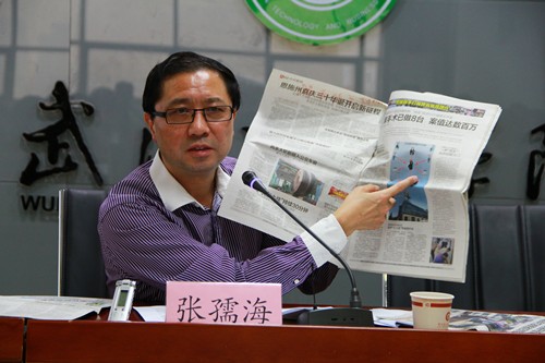 新闻中心讯(见习记者 隗晓璐 李雄风)10月17日下午,楚天都市报常务副总编辑张孺海在武汉工商学院第三会议室,为该校新闻中心大学生记者团、广播台、电视台70多名学生记者做了主题为“媒体融合下的纸媒坚守”的讲座。讲座由宣传策划部部长狄奥主持。