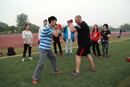 “我教大家主要是用于锻炼和防身,而不是为了去打架”,来自澳大利亚的外教lyle告诉记者,他以前是一名警察,做警察36年,每日进行体格训练和拳击训练已经成为一种习惯,来武汉教书以后,发现很多学生体质瘦弱,便萌生了带学生一起训练的想法,和班上的学生交流后,学生们都很愿意参加,因此,自2013年10月开始,除了寒暑假外,一直坚持每周一到周四每天早上6:45到7:30教学生练习。