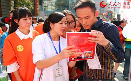 武汉10月26日电(罗袁璐 韦晴)25日上午,“首届湖北省青年志愿者公益嘉年华”在武汉市楚河汉街大戏台举行,全国最美乡村教师、鹤峰县高原小学副校长邓丽带领母校武汉工商学院“邓丽班”的八名大学生志愿者,在此次嘉年华上宣传“鹤峰县阳光助学志愿者协会”发起的“留守女童温馨之家”公益项目,呼吁社会各界通过为乡村留守女童打造一个温馨、大方、整洁的卧室的方式,共同关注和关爱留守女童。