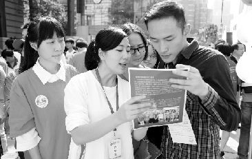 昨日,武汉工商学院“邓丽班”学生志愿者为热心市民介绍“留守女童温馨之家”公益项目。