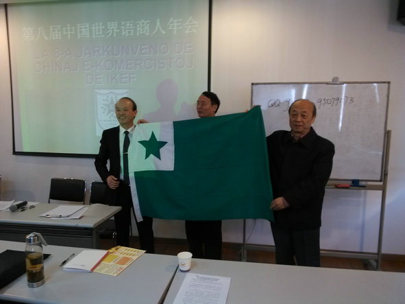 图为天津市世界语协会会长韩祖武(右一)将会旗移交到武汉工商学院国际合作交流处处长代胜桥(左一)的手上