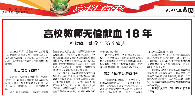 在他的感染和鼓励下,大学生们也开始加入到献血队伍中。2014年3月5日,武汉工商学院电子商务学院学生组成的公益组织“邓丽班”成立了一支50人的无偿献血小分队。当天,第一批献血小分队成员12人到武汉血液中心献血。