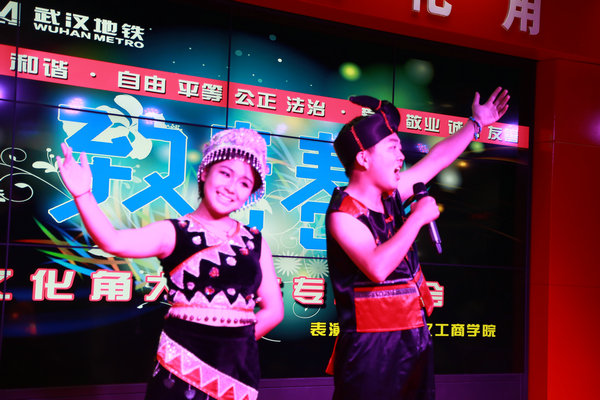 新闻中心(记者 王铖焱)11月21日晚,武汉地铁运营公司联合武汉晨报,在洪山广场站“地铁文化角”重磅推出了“致青春”大学生才艺秀系列演出第一场,作为开场秀的演出学校,武汉工商学院同学的表演令现场气氛爆棚,周边市民纷纷前来观看精彩演出。