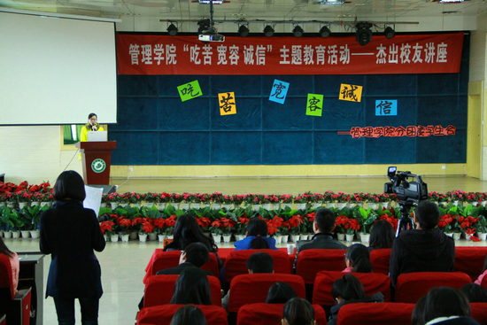 她还表示,学校管理学院开展的“吃苦 宽容 诚信”主题活动很有意义,大学生只要有吃苦耐劳的精神,有一颗宽容的心,能够做到诚实守信,将来一定会有出息。