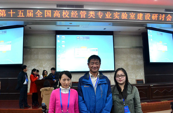 图为经济管理实验教学示范中心主任毛志山一行3人参加会议时合影