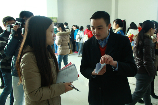 图为宣传策划部副部长蓝静在采访艺术设计学院副院长何彦彦 摄影:王铖焱