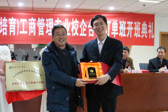 图为海底捞人力资源总监邹志东与武汉工商学院校长助理左宗文为订单班揭牌 摄影:李鳌