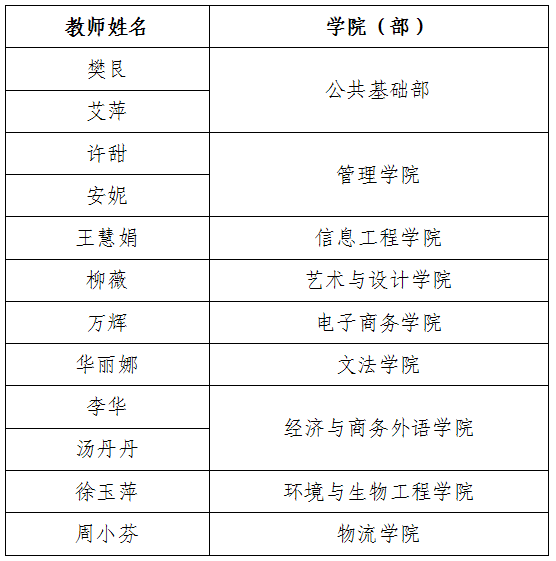 新闻中心讯(记者 万风)日前,由武汉工商学院学生工作部、团委、人事部、工会联合举办的学校第二届“我最喜爱的老师”评选活动经过推荐、评选、公示等环节,结果已经揭晓。来自9个学院(部)的12位教师光荣获评。名单如下: