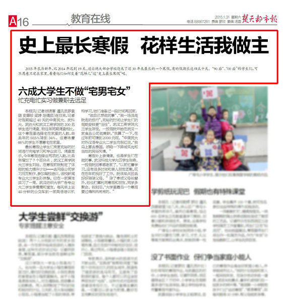 最长寒假让学生们有更充裕的时间进行充电学习和专业实习。调查显示,今年寒假选择这两项的人数,比去年增加了7个百分点。武汉工商学院大三学生刘晗,在寒假前就制定了详细的能力提升计划——去网络公司学习网页制作、参加驾校培训。该校新闻专业大三学生孙琳黎,已在一家媒体实习了一周。武汉纺织大学广告专业大二学生李雯雯和室友,每天早上坐40分钟的公交车到一家英语培训机构学习,她们准备过一段时间再回家。