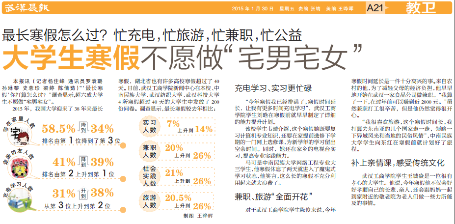 本报讯(记者杨佳峰 通讯员罗袁璐 孙琳黎 史蓉珍 梁婷 陈倩茹)“‘最长寒假’你打算怎么过?”调查显示,超六成大学生不愿做“宅男宅女”。