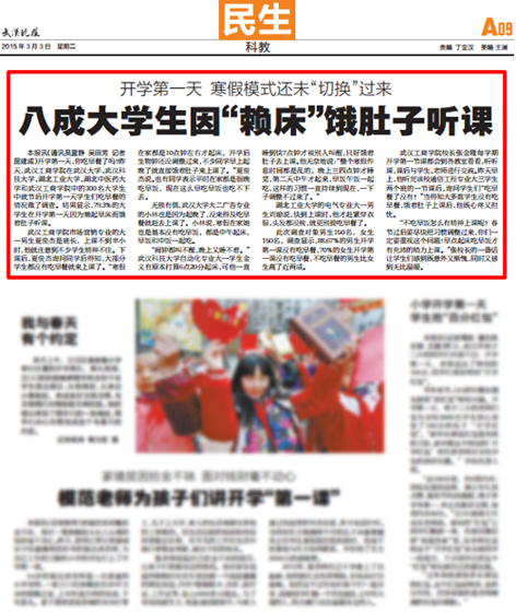 本报讯(通讯员蓝静 吴田芳 记者屈建成)开学第一天,你吃早餐了吗?昨天,武汉工商学院在武汉大学、武汉科技大学、湖北工业大学、湖北中医药大学和武汉工商学院中的300名大学生中就节后开学第一天学生们吃早餐的情况做了调查。结果显示,79.3%的大学生在开学第一天因为懒起早床而饿着肚子听课。