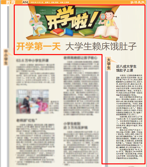 本报讯(记者杨佳峰通讯员 蓝静 吴田芳)节后开学第一课,你吃早餐了吗?3月2日,武汉工商学院新闻中心记者团在本校、武汉大学、武汉科技大学、湖北工业大学、湖北中医药大学的300名大学生中就节后开学第一课学生们吃早餐的情况做了调查。结果显示,79.3%的大学生在开学第一课因为难起早床而饿着肚子听课。